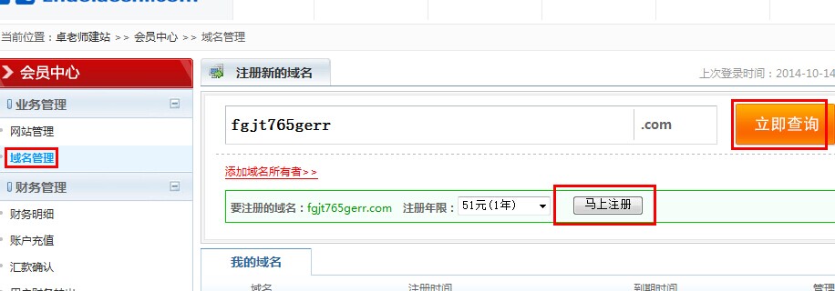 然后登陆到会员中心--点击域名管理--输入您要注册的域名,点击查询,即可看到注册字样,如下图: