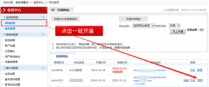 首先,在会员中心》网站管理》找到自己的网站后点击管理,登陆到智能建站控制面板